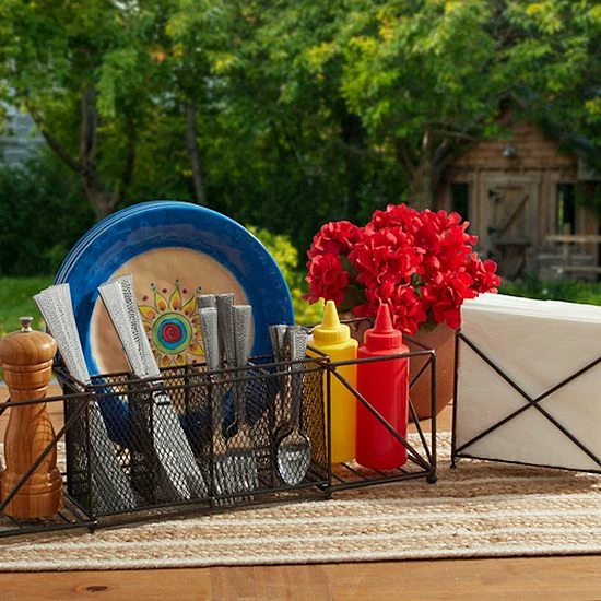 Keep everything you need for outdoor dining, including dinnerware, napkins and flatware, in this centerpiece-worthy picnic caddy from Mikasa.