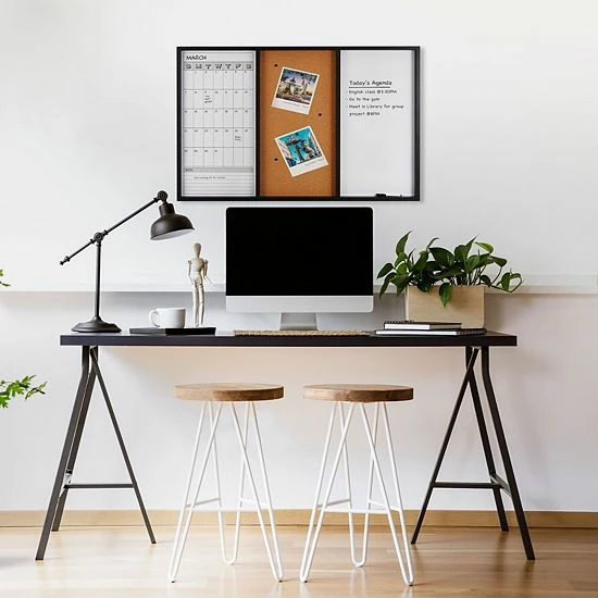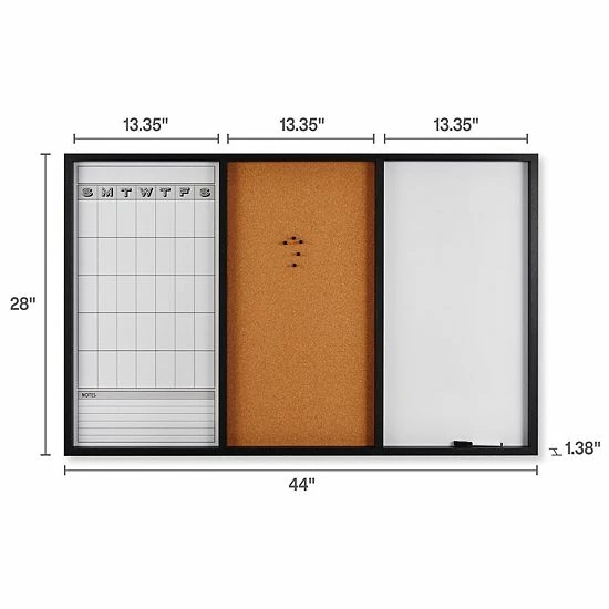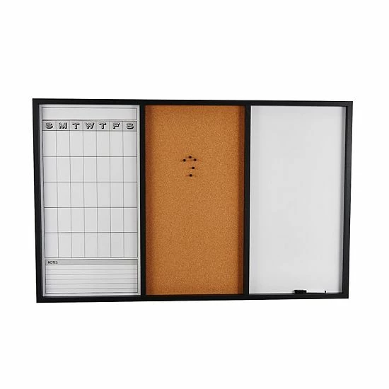 The Mikasa Black Tri-Board includes a cork board, whiteboard calendar and whiteboard all in one.