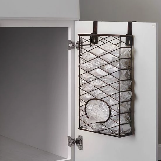 - Basket features a large opening on top to insert bags, and a dispenser opening on front for quick removal of bags